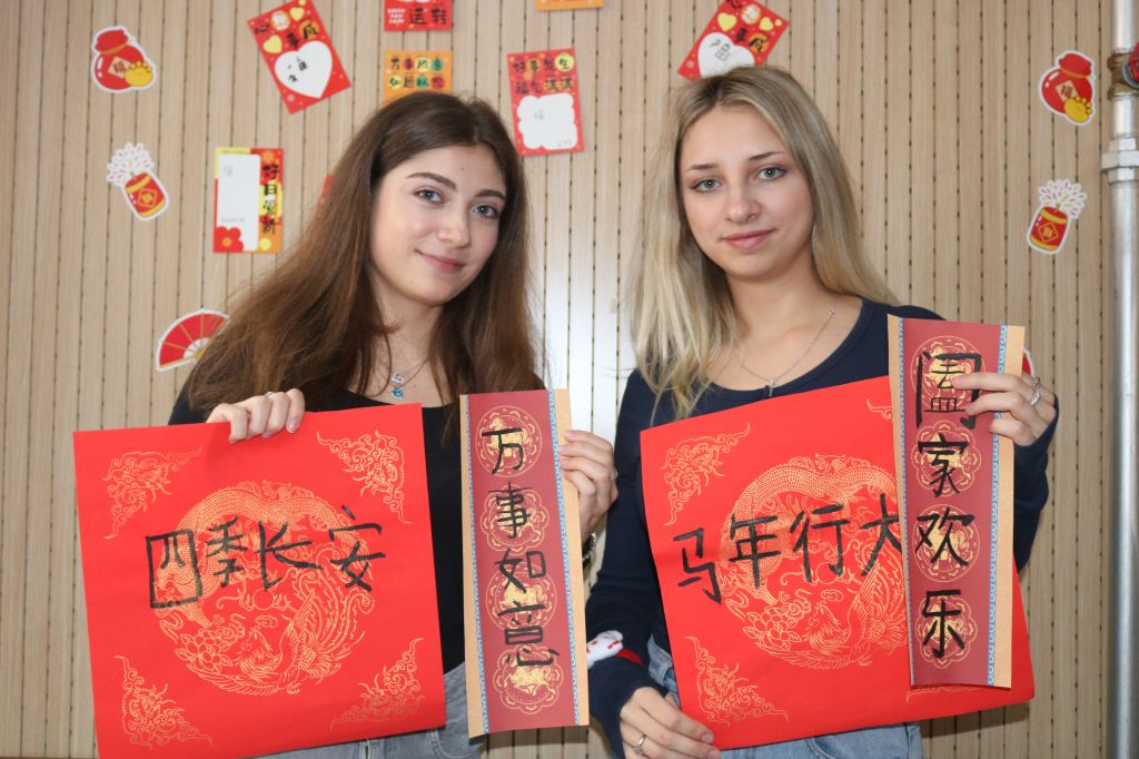 活动现场年味浓郁、暖意融融。“马年大吉”主题打卡点前人头攒动,吸引众多师生驻足打卡留念。在游戏区,投壶、猜灯谜、蒙眼摸“福”等活动,让大家在欢声笑语中进一步了解中国春节丰富的文化内涵与民俗传统。在文化体验区,留学生们泼墨挥毫,写下端庄大气的“福”字与寓意吉祥的春联,笔墨间尽显对中华书法的热爱;剪纸、剪窗花体验环节,大家巧手翻飞、灵动创作,一幅幅精巧别致的作品跃然眼前。在新年愿望墙前,留学生们郑重写下寄语,表达对未来在中国学习、生活的美好期盼与真挚祝福。