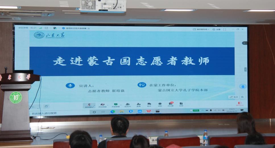 为进一步推进汉语国际教育人才培养,帮助学生深入了解外派汉语教师志愿者项目政策,4月21日,我院举办国际中文教育志愿者外派政策专题宣讲会。本次宣讲会特邀山东大学国际事务部侯金萍老师主讲,蒙古国立大学孔子学院志愿者教师崔培获分享经验。
