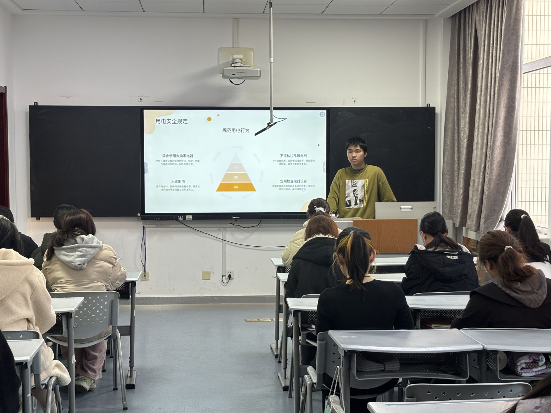 随后,学院组织各班级开展安全主题班会,通过剖析违规用电、携带违禁品引发的安全事故案例,强调严禁将电动车充电器、大功率电器(电煮锅、热得快等)带入宿舍,明确管制刀具、明火器具等违禁品的管理要求;同时,引导学生现场自查宿舍隐患,分享“规范使用插排”“及时清理杂物”等日常安全习惯,进一步明确了个人在宿舍安全中的主体责任。此外,班会还普及了宿舍逃生通道维护、基础消防器材使用等应急常识,全面提升学生应急防范能力。