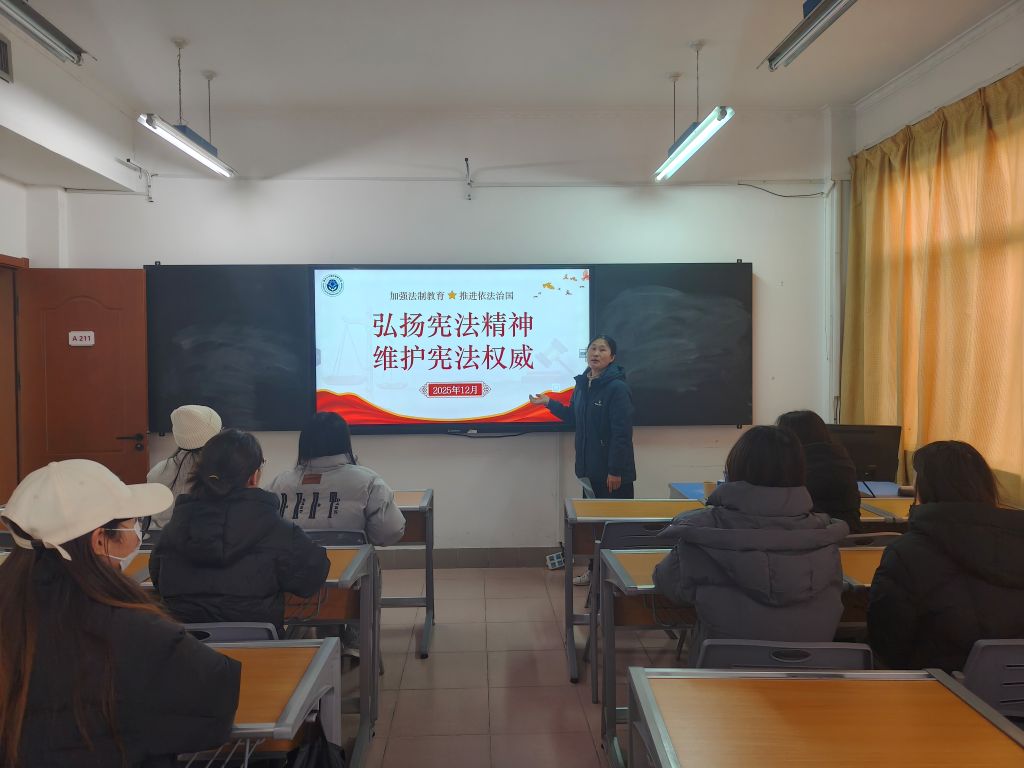 线上环节,组织全体学生参与第十届全国学生“学宪法,讲宪法”活动,大家利用碎片化时间学习宪法知识、答题闯关,深化对宪法内容的记忆;12月4日国家宪法日当天,各班级组织观看CCTV1播出的“宪法的精神 法治的力量——2025年度法治人物”专题栏目,通过权威内容强化法治认知。线下方面,全院各班级全覆盖开展宪法主题班会,结合“报、刊、网、微、端、屏”等宣传阵地,通过宪法条文诵读、法治案例分享等形式增强互动性,提升了宪法宣传针对性与有效性。